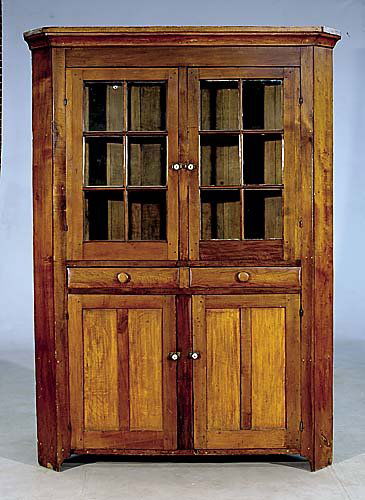 American cherry, walnut and pine corner cupboard,