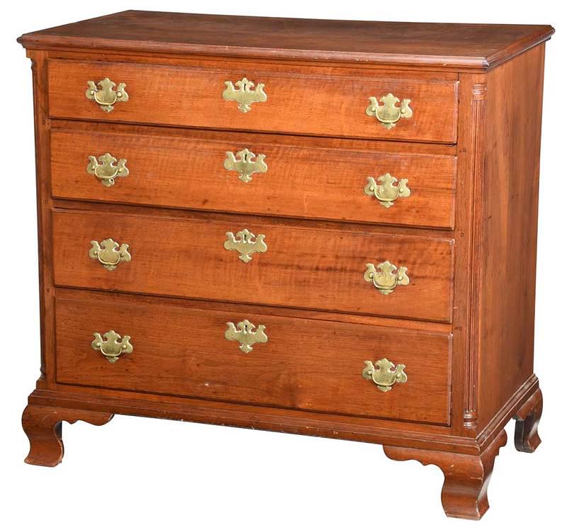 SoldPennsylvania Chippendale Walnut Chest of DrawersPhiladelphia, circa 1770, highly figured walnut throughout with mellow old surface, molded top over four graduated drawers, highly figured facings and original brass pulls, dovetailed construction witSee Sold Price