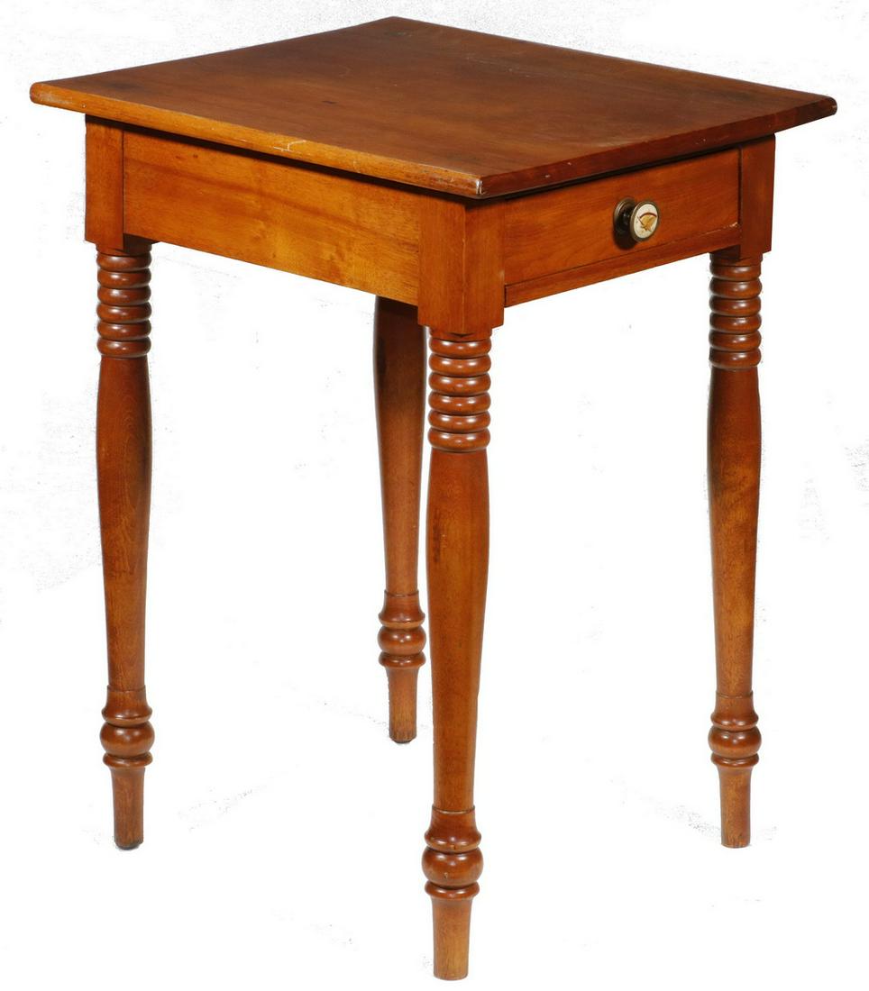 SoldAMERICAN COUNTRY SHERATON WORK STANDIn cherry, circa 1830, with thin overhanging top, drawer with turned knobs, pine secondary, on ringed turned tapered round legs, with vasiform ball feet, 28 1/2" x 19" x 17 1/2" (including knobs), verSee Sold Price