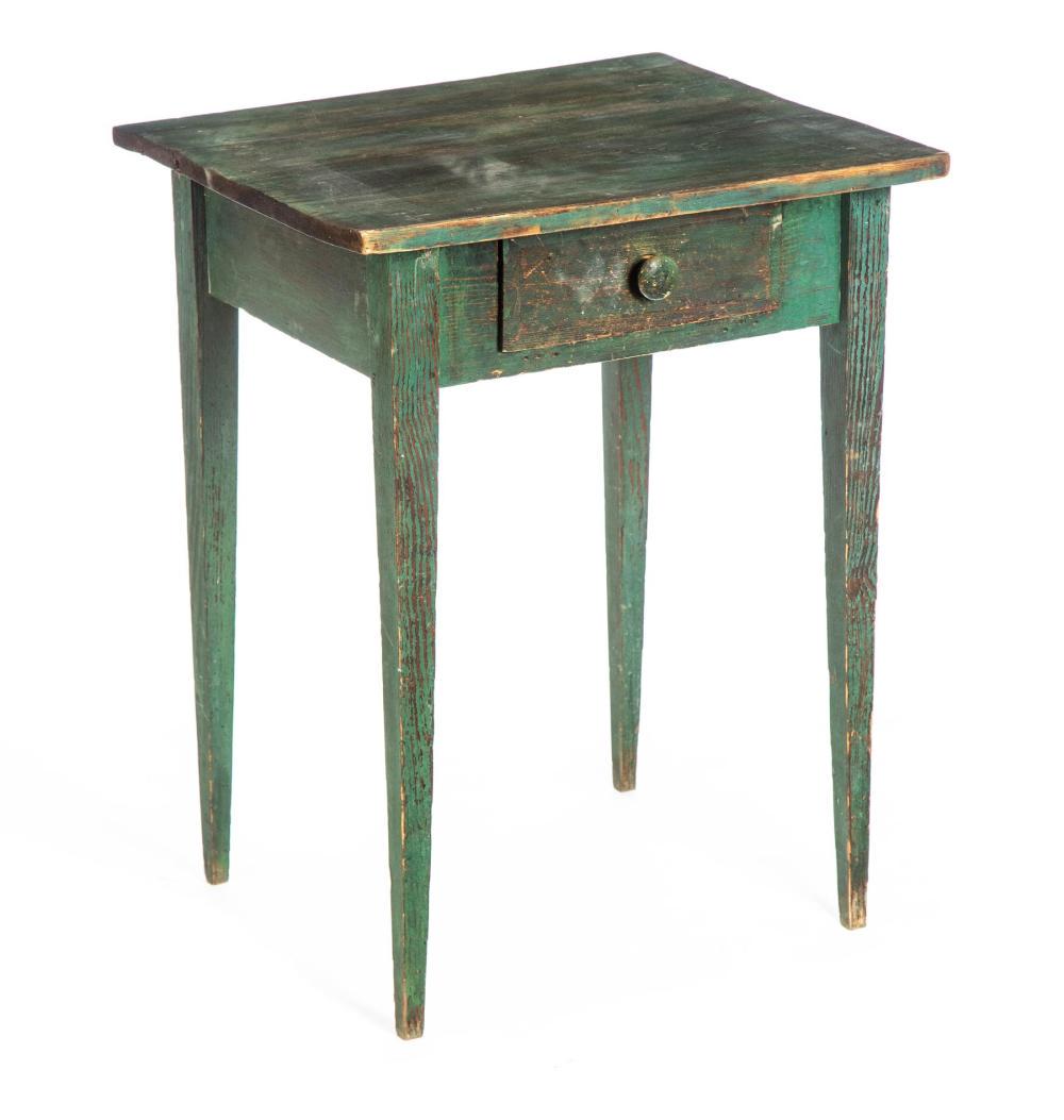 SoldAMERICAN / NEW ENGLAND COUNTRY HEPPLEWHITE PAINT DECORATED STANDone drawer with original large turned wood knob; tapering legs; 28"h; top 16" sq. NOTE: We cannot approve bidders during the auction. Please register as soon as possible.See Sold Price