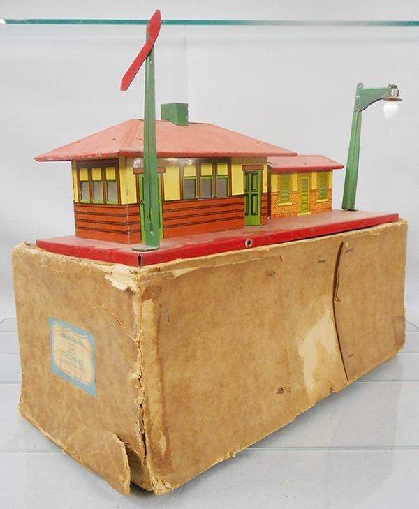 SoldTHREE PIECE GILBERT AMERICAN FLYER STATION SETTHREE PIECE GILBERT AMERICAN FLYER STATION SET, MID CENTURY. Tin litho comprising a freight station with street lamp and signal, an American Flyer billboard steam whistle control, and another item. TSee Sold Price