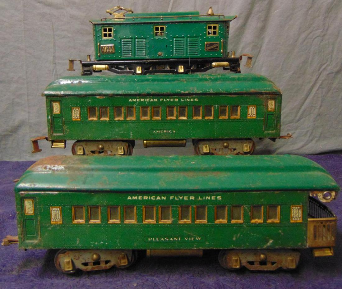 SoldAMERICAN FLYER AMERICA SET WITH THREE CARSPre-war wide gauge set, includes No. 4644 electric style engine, together with two lithographed green America passenger cars and Pleasant View observation car. Loco 11 1/2" l.See Sold Price