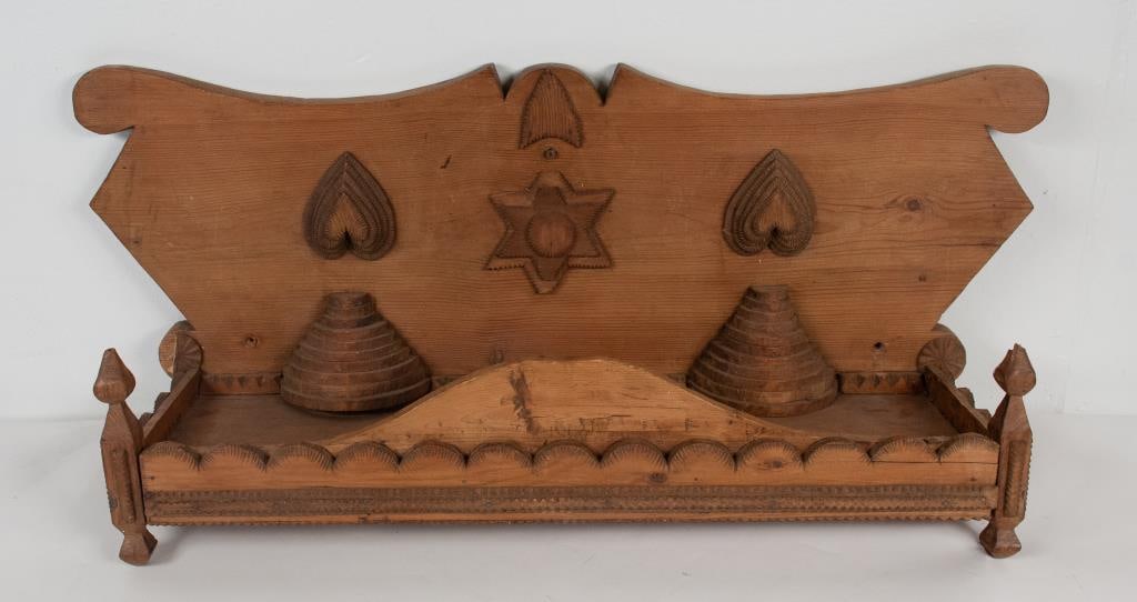 AMERICAN FOLK / TRAMP ART WALL BOX AND MINIATURE DRESSER, LOT OF TWOMar 06, 2026Antique Tramp art wall pocket with con frontal facesMar 05, 2026Panel with allegories in Gothic registers, European Historicist School, 19th Century3 days LeftAMERICAN FOLK ART PAINTED WALL POCKET / SMOKING BOXMar 06, 2026BRITISH OR CONTINENTAL PAINTED PINE SETTLE CHAIRMar 06, 2026Two Folk Art Wooden ShelvesMar 07, 2026Pine Wood Wall ShelfAmerican Country Dry SinkMar 07, 2026Rustic Painted Wood Hanging Shelf 48 x 9 x 19 Country Style3 days LeftAMERICAN, PROBABLY SOUTHERN, FEDERAL CARVED PINE AND POPLAR MANTELMar 06, 2026Vintage Wood Tramp Art Butler Wall Mount Rack Holder with Glass FrontMar 06, 2026AMERICAN FOLK / TRAMP ART OVERSIZED WALL-POCKET / FRAMEMar 06, 202619th Century American Walnut Canterbury StandMar 07, 2026Pennsylvania lift top blanket chest, paint decorated with 3 panels, dovetailed, turned foot, early2 days LeftMID-ATLANTIC PAINTED PINE TOOL CARRIER / TRAYMar 06, 2026Albert Zahn Folk Art Clock ShelfMar 11, 2026