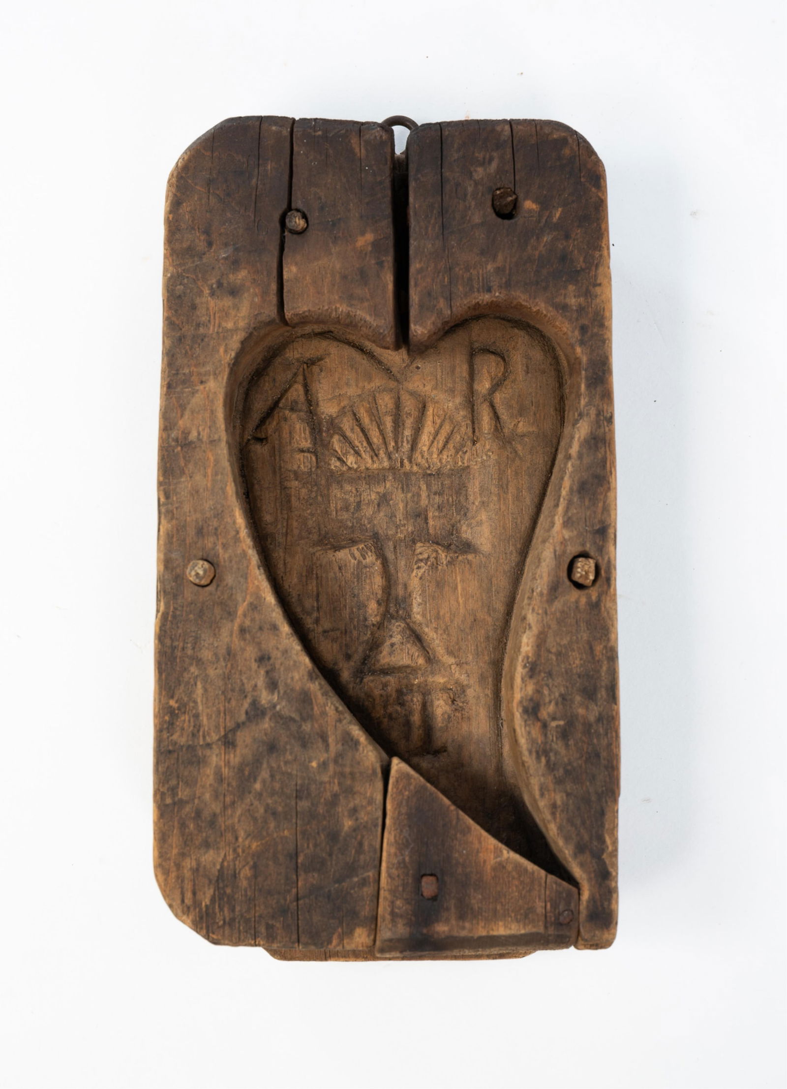 AMERICAN HEART-FORM MAPLE SUGAR MOLD WITH INITIALS.
