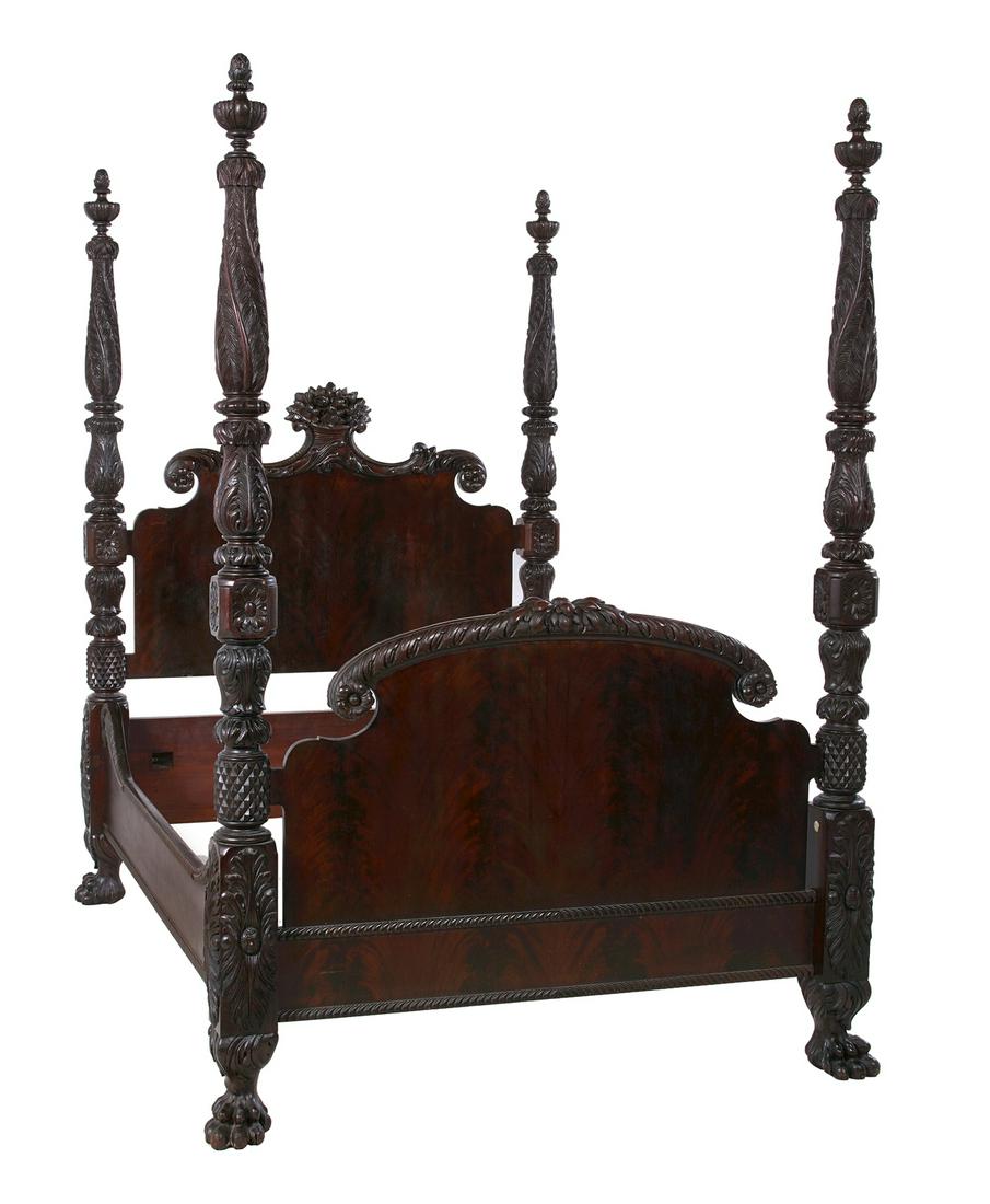American Late Classical Carved Mahogany Four Poster Double Bed, late 19th c., H.- 81 in. Int. W.- 56American Late Classical Carved Mahogany Four Poster Double Bed, late 19th c., the broken scrolled acanthus pediment, pineapple finials over ring turned vasiform posts with elaborate elongated twist ac
