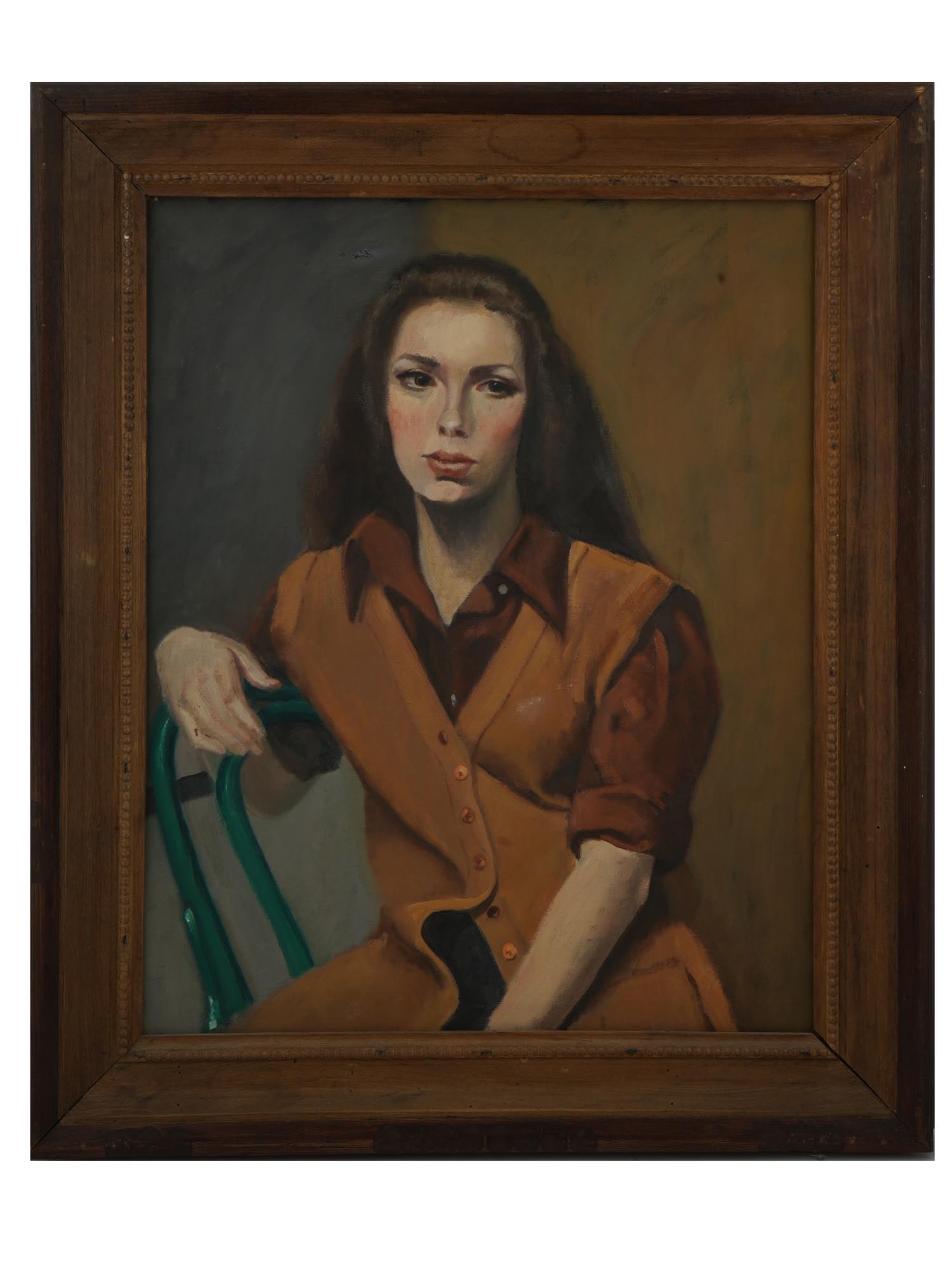 SoldAMERICAN OIL PORTRAIT PAINTING BY GEORGE DANGMANA vintage American oil on canvas portrait painting by George Dangman, 1909 to 1989. Circa mid 20th century. The painting depicts a woman with a pensive look on a blue background. Signed on the back siSee Sold Price