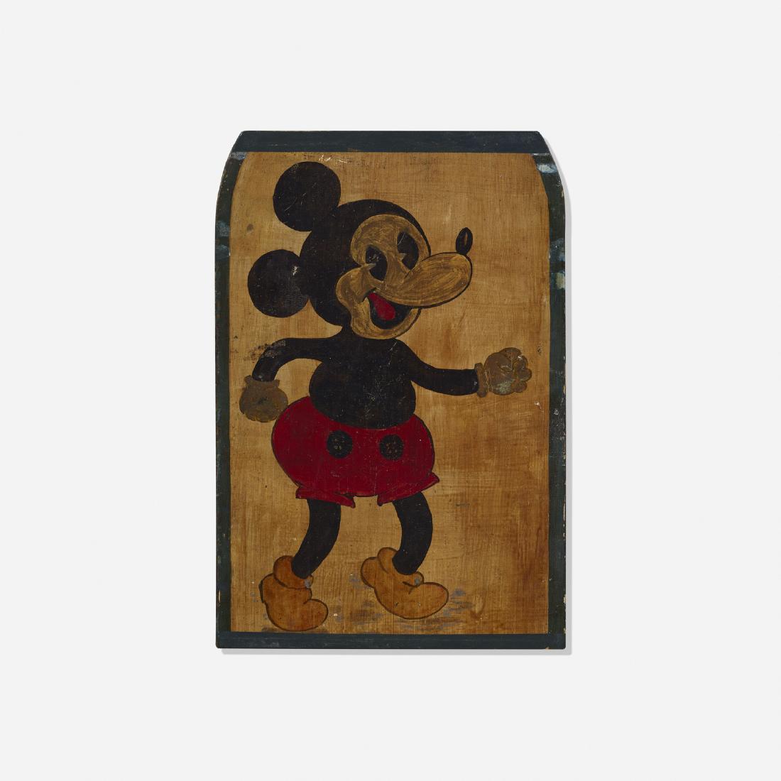 SoldAMERICAN MICKEY MOUSE DECORATIVE PLAQUE.Ca. 1930s. Home made wooden cut out of Mickey with original polychrome paint. Crazing and darkened varnish, minor wear. 10"h. not including stand (taped post).See Sold Price