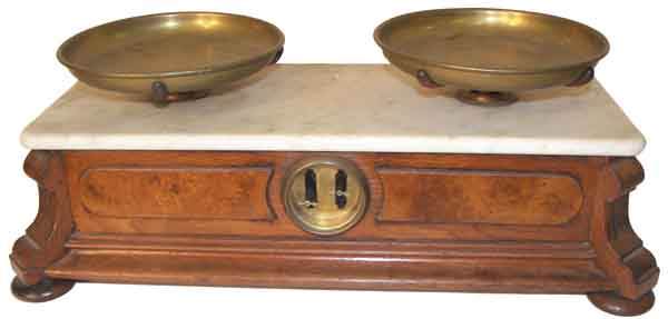 American Ren. burled walnut marble top scale