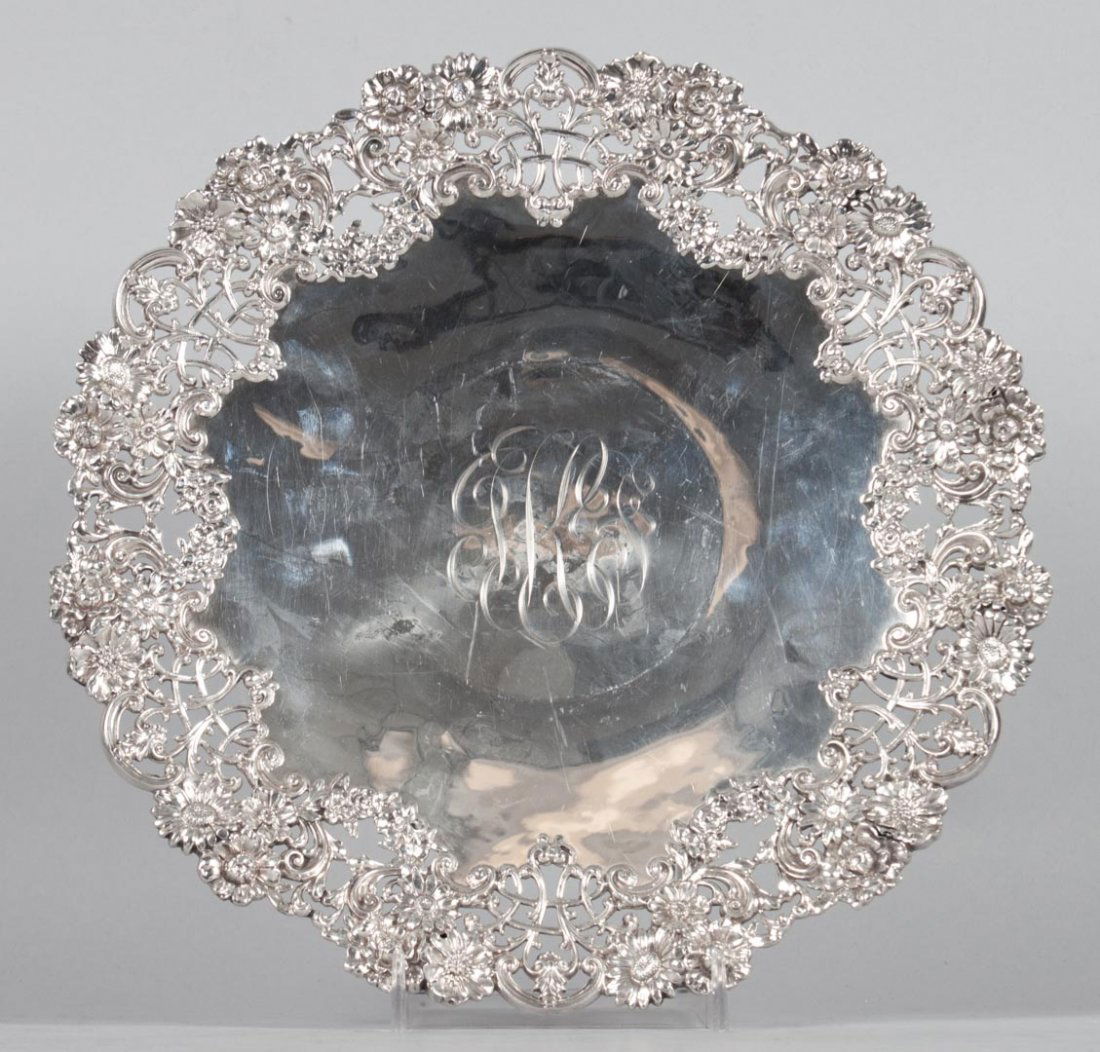 American reticulated repousse silver cake stand