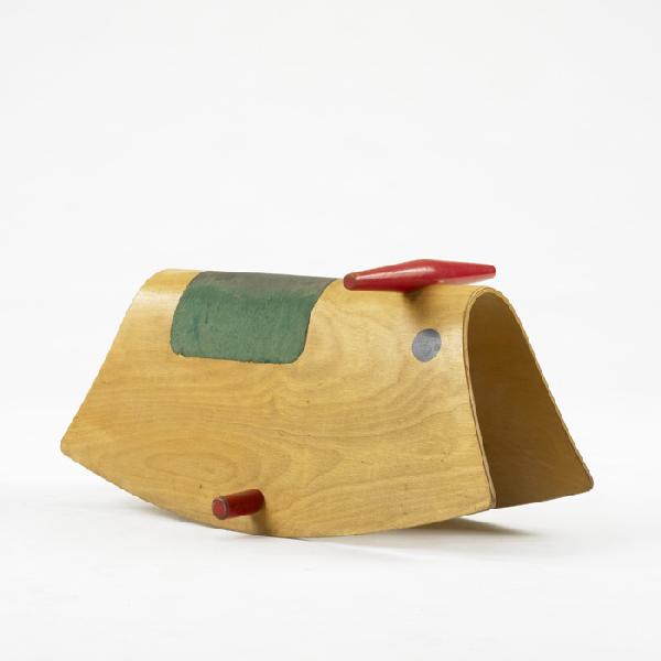 SoldFOLK ART CARVED ROCKING TOY BY P. "PAM" SCHIFFERL.American (Wisconsin), 20th Century. Painted wood. Signed "P. Schifferl". 9.25"h. 15"w. 3.75"d.See Sold Price