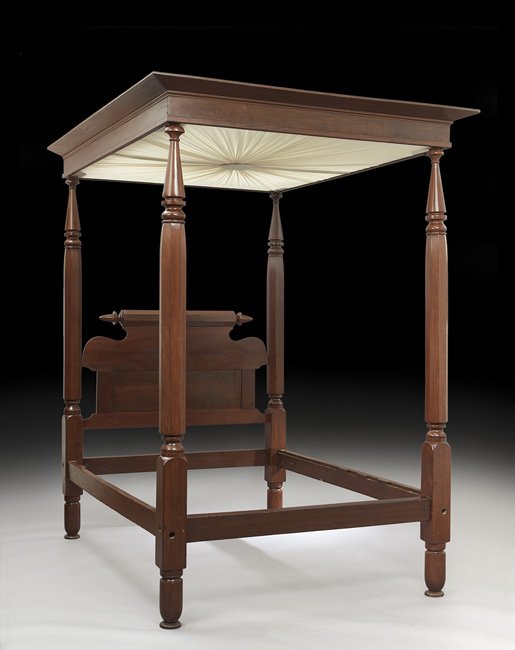 SoldAmerican Sheraton Stained Poplar Tester BedAmerican Sheraton Stained Poplar Tester Bed second quarter 19th century, the sunburst-upholstered tester supported by segmented turned posts, supporting a single-board shaped headboard. h. 92", insideSee Sold Price