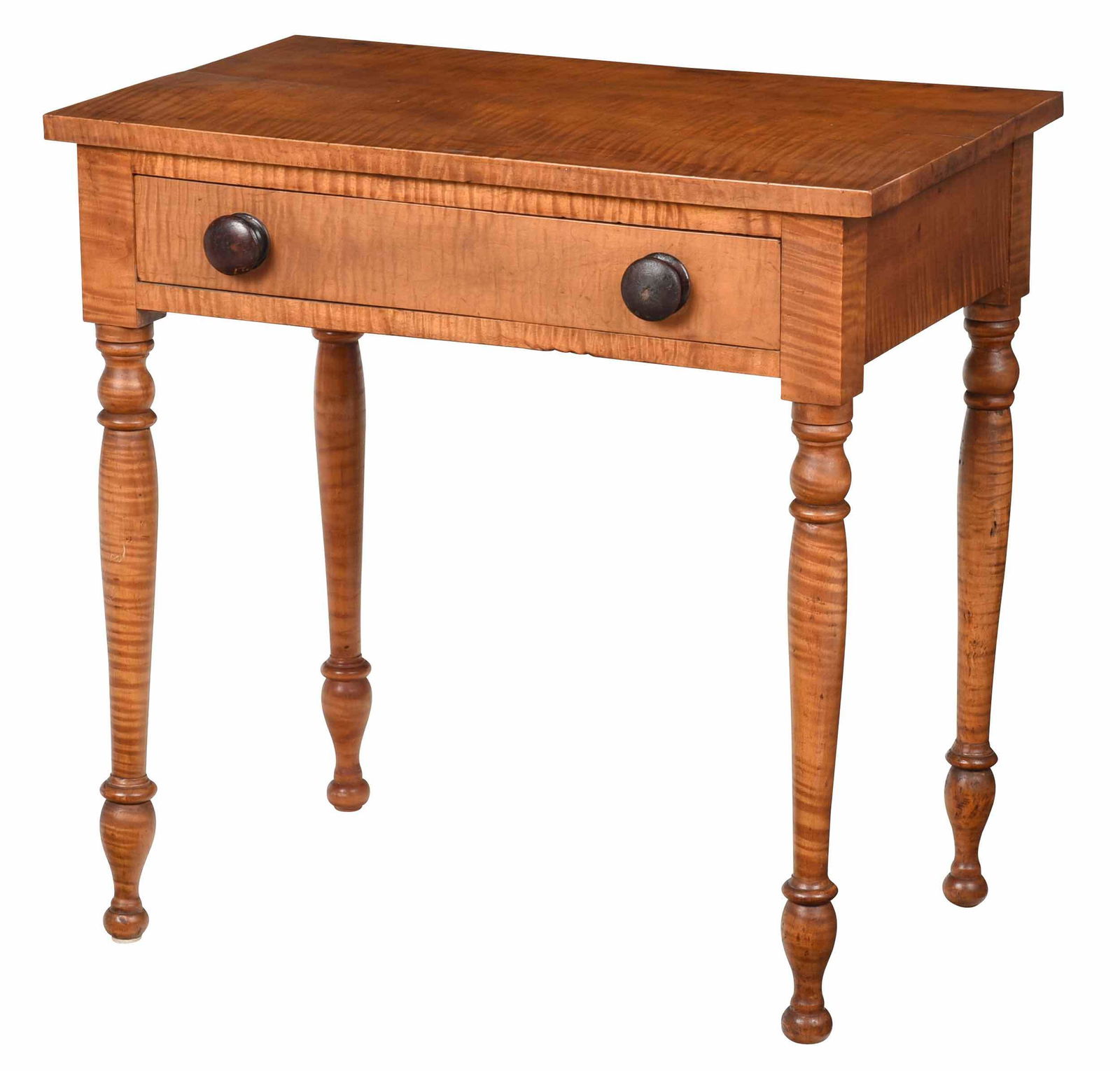 SoldAmerican Sheraton tiger maple single drawer tableAn American Sheraton tiger maple single drawer side tablefirst half 19th centuryheight 27 3/4in (70.5cm); width 19in (48.5cm); depth 18 1/2in (47cm) Provenance:Property from a Private Collector, PasadSee Sold Price