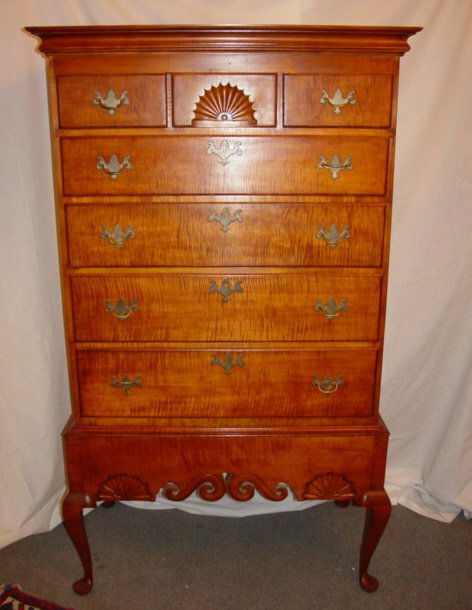 AMERICAN TIGER MAPLE CHEST HIGHBOY ON STAND EXCEPT