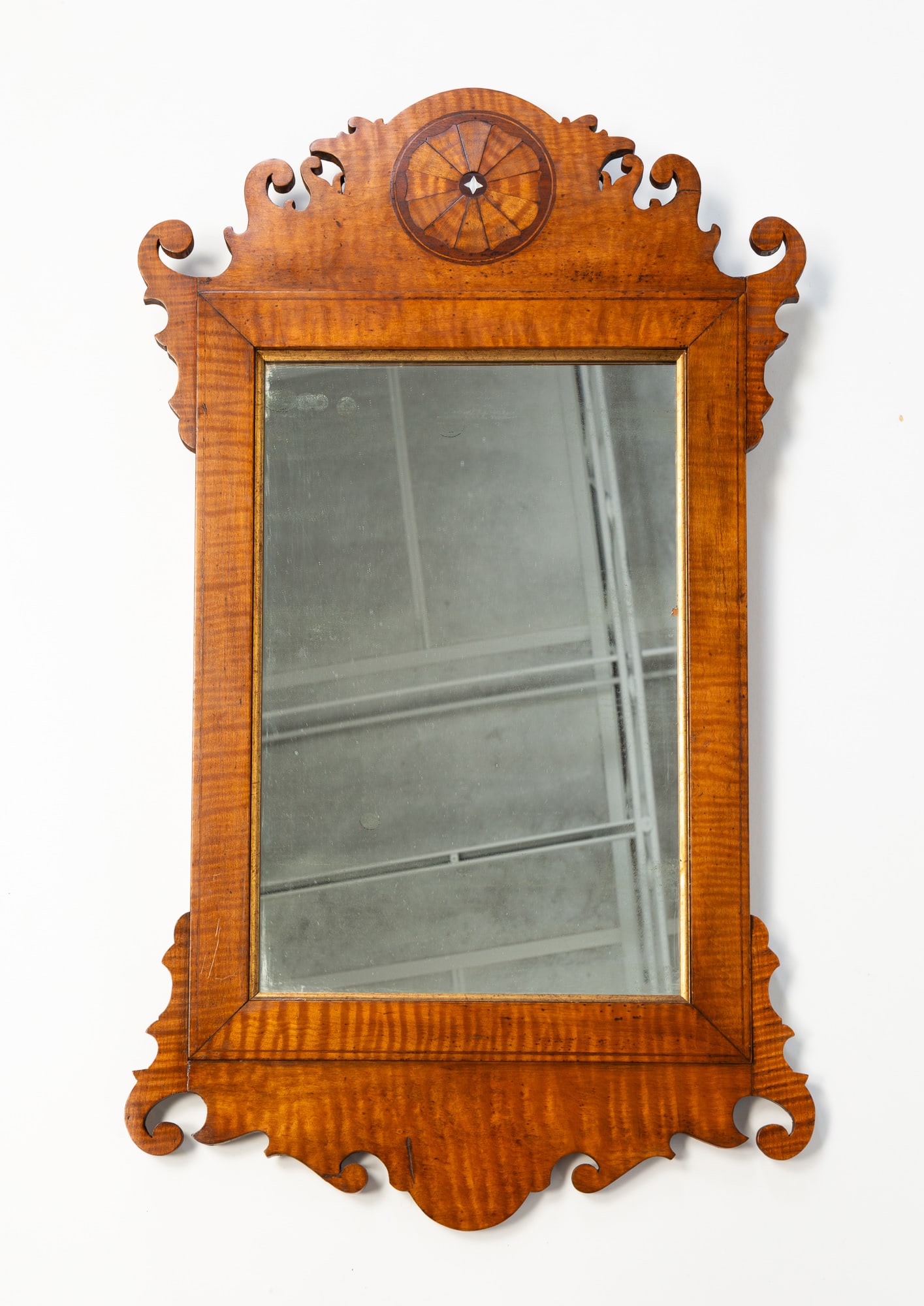AMERICAN TIGER MAPLE CHIPPENDALE SCROLL CUT MIRROR.