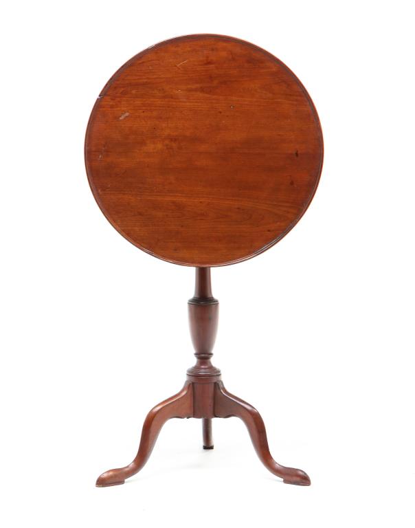 SoldAMERICAN CHERRY TILT-TOP CANDLESTAND.First half 19th Century. Having a round hinged top above a ring turned and teardrop standard rising on three cabriole legs and cut out feet. 27"h. 17.5"w. 17.75"d.Provenance: From the Collection of PeSee Sold Price