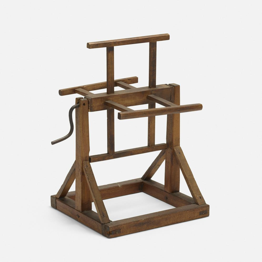 SoldPA 19th Century Mixed Wood Wool Winder.Pennsylvania 19th Century Mixed Wood Wool Winder. Double "Squirrel Cage" wheels on an adjustable vertical shaft with platform base. 55"h. Condition: Very good with minor wear.See Sold Price