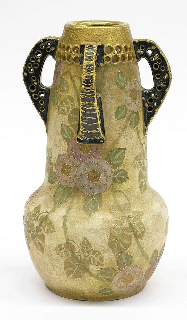 SoldArt Nouveau Amphora Buttressed 4 Handled Vase 11"Art Nouveau style Amphora Austrian floral vase. Crafted of ceramic. Features four flying buttress style handles on a bulbous bodied base with narrow neck. Decorated with roses on a yellow ground. GiltSee Sold Price