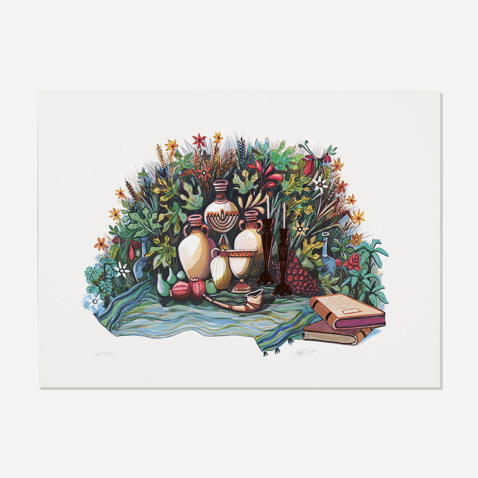 SoldAmram Ebgi Limited Edition Print, "Shavuoth"Amram Ebgi (Israel, 1939- ) limited edition print, "Shavuoth", sight size 27" x 39", signed, titled and numbered 43/200 in pencil lower margin, with embossing and hand coloring; size as framed 37.5" xSee Sold Price