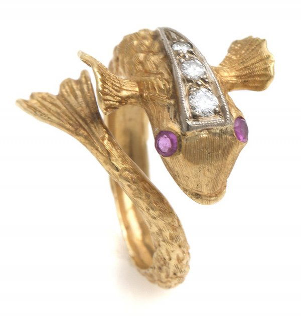 An 18 Karat Yellow Gold, Diamond and Ruby Fish Ring, 4.