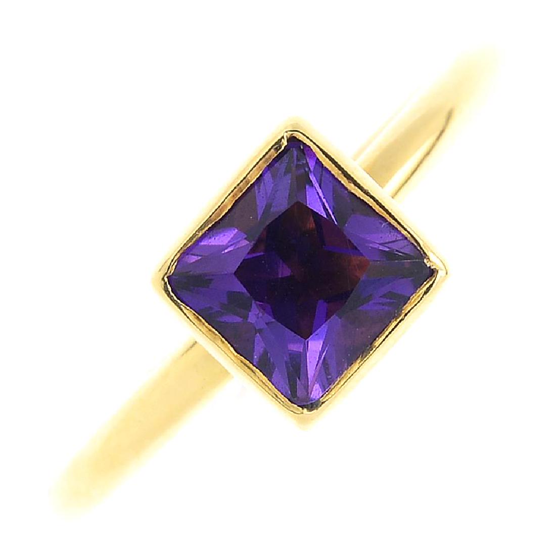 An 18ct gold amethyst ring. The square-shape amethyst,