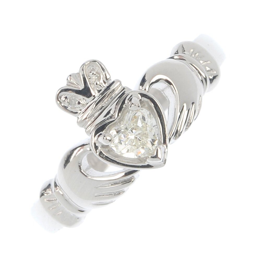 SoldAn 18ct gold diamond ring. The square-shape diamondAn 18ct gold diamond ring. The square-shape diamond quatrefoil, with tapered shoulders and plain band. Estimated total diamond weight 0.50ct. Hallmarks for Birmingham. Ring size J1/2. Weight 3gms. OveSee Sold Price