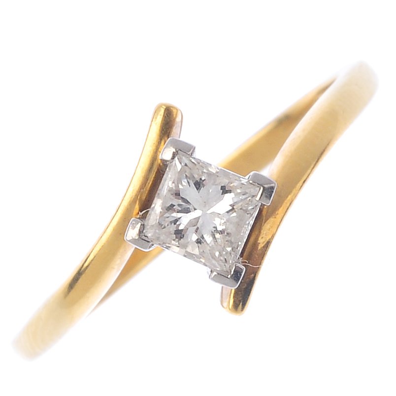 SoldAn 18ct gold diamond single-stone ring. TheAn 18ct gold diamond single-stone ring. The square-shape diamond, with tapered band. Diamond weight 0.35ct, stamped to band, estimated tinted colour, P1 clarity. Hallmarks for Birmingham. Ring size M.See Sold Price