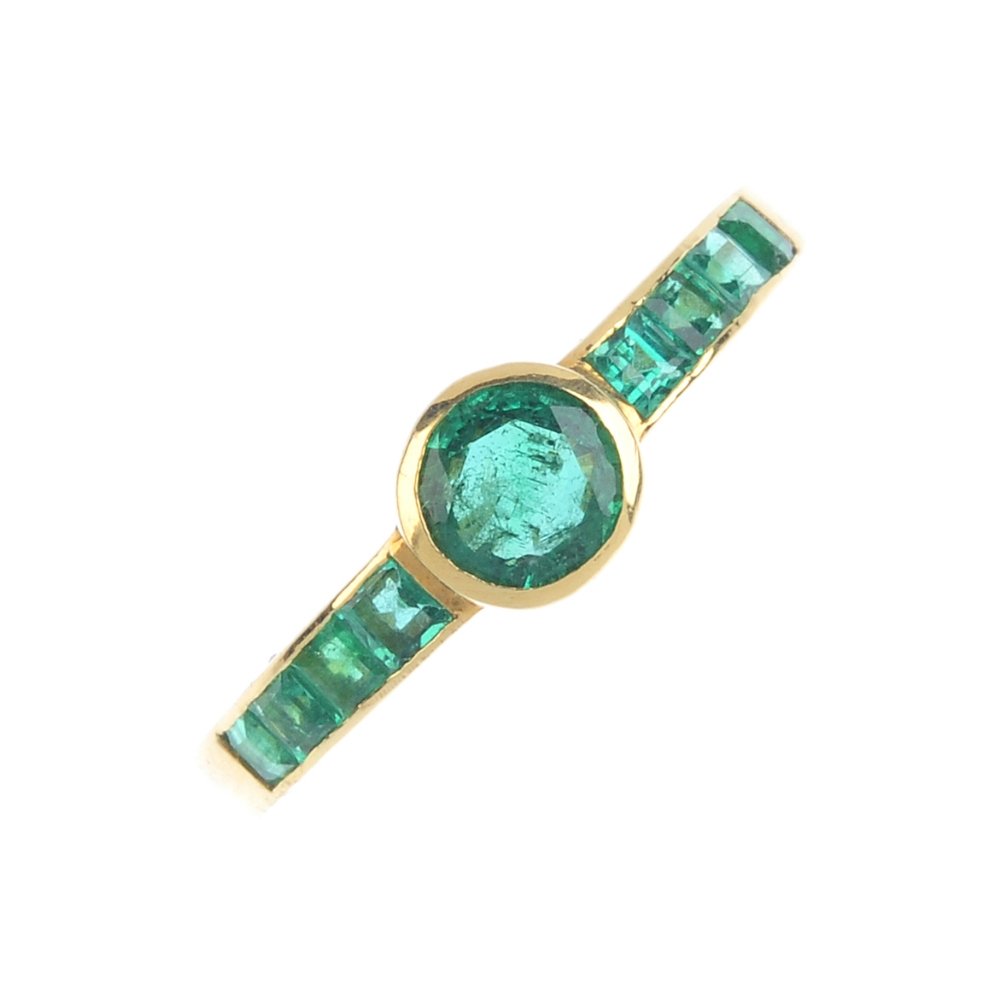 SoldAn 18ct gold emerald and diamond ring. TheAn 18ct gold emerald and diamond ring. The circular-shape emerald, inset to the slightly curved band, with scattered brilliant-cut diamond sides. Estimated total diamond weight 0.10ct. Hallmarks for LSee Sold Price
