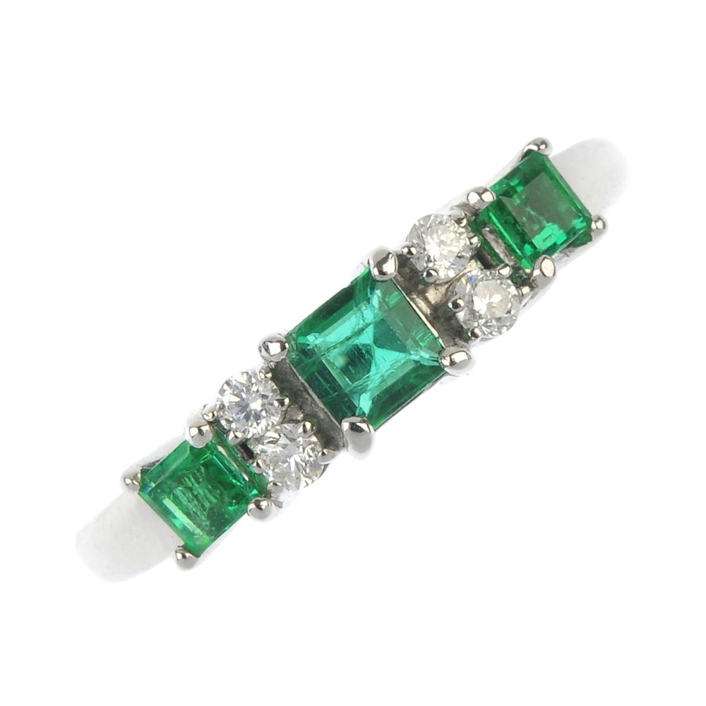 An 18ct gold emerald three-stone and diamond ring.