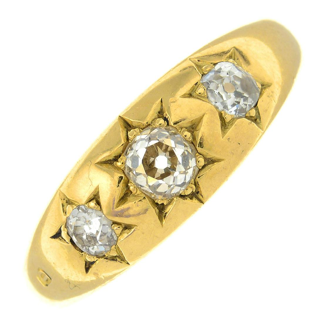 An 18ct gold old-cut diamond three-stone ring.