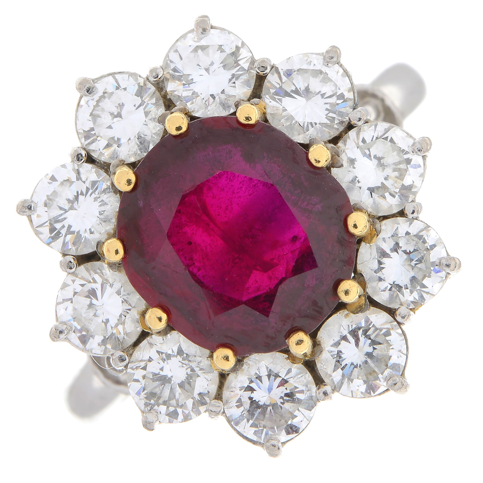 SoldAn 18ct gold ruby and diamond cluster ring. TheAn 18ct gold ruby and diamond cluster ring. The oval-shape ruby, within a brilliant-cut diamond border, to the plain band. Estimated total diamond weight 0.65ct, J-K colour, SI-P1 clarity. Hallmarks fSee Sold Price