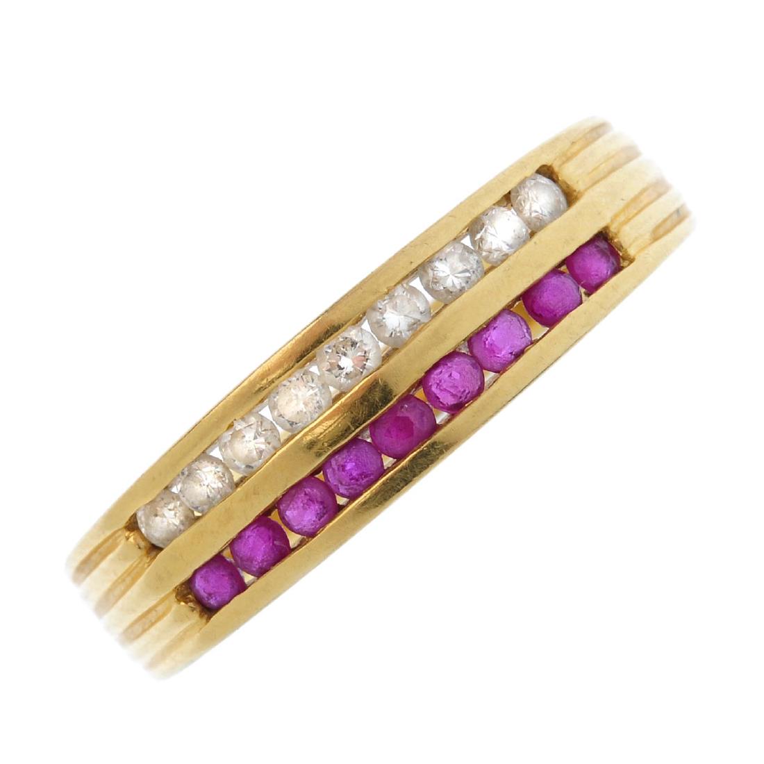 An 18ct gold ruby and diamond band ring. Designed as