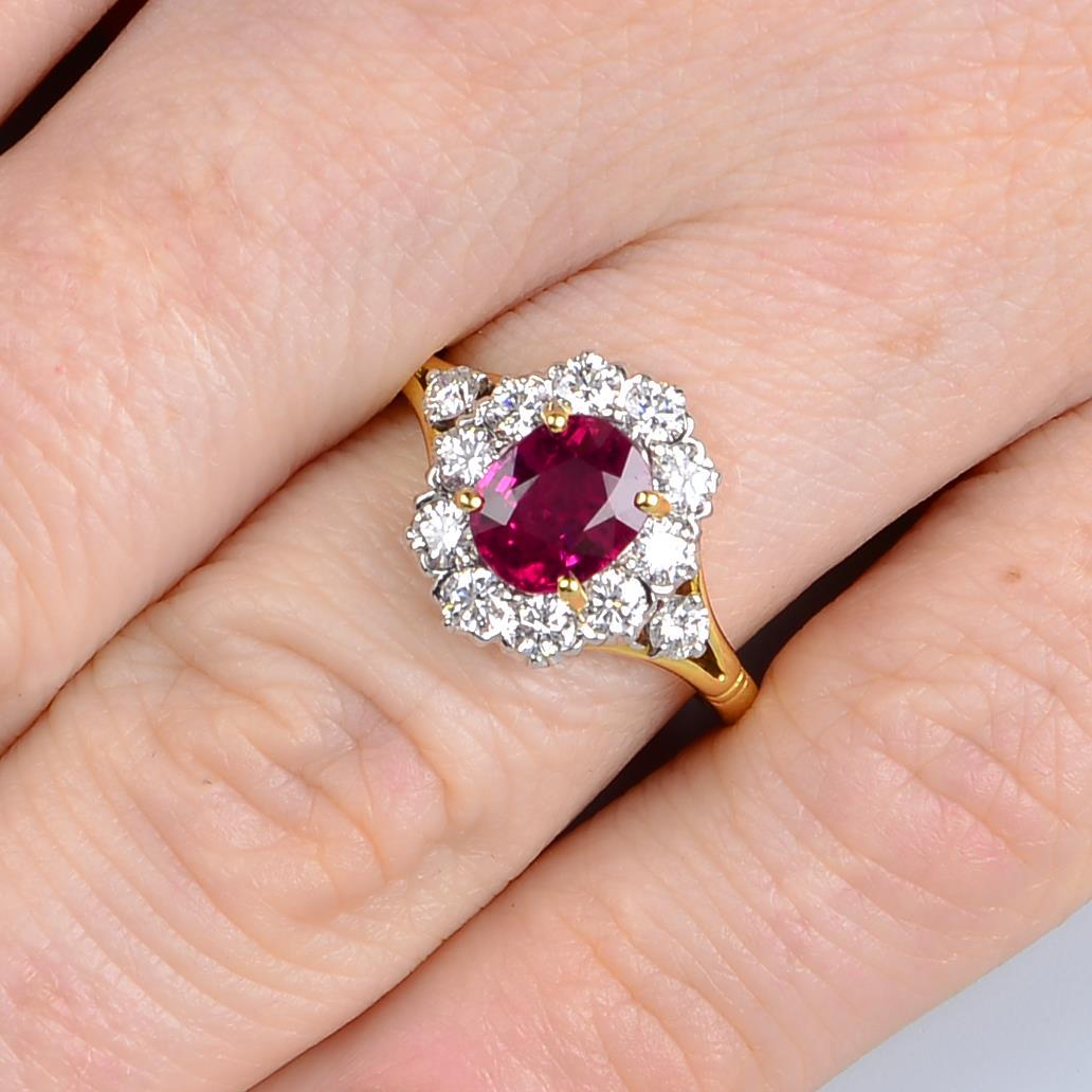 An 18ct gold ruby and diamond cluster ring. Ruby