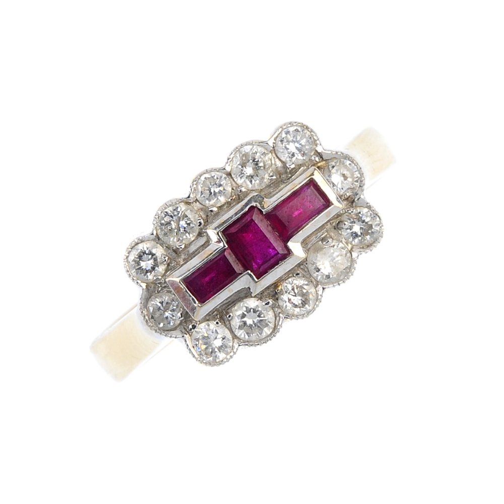 An 18ct gold ruby and diamond cluster ring. The three