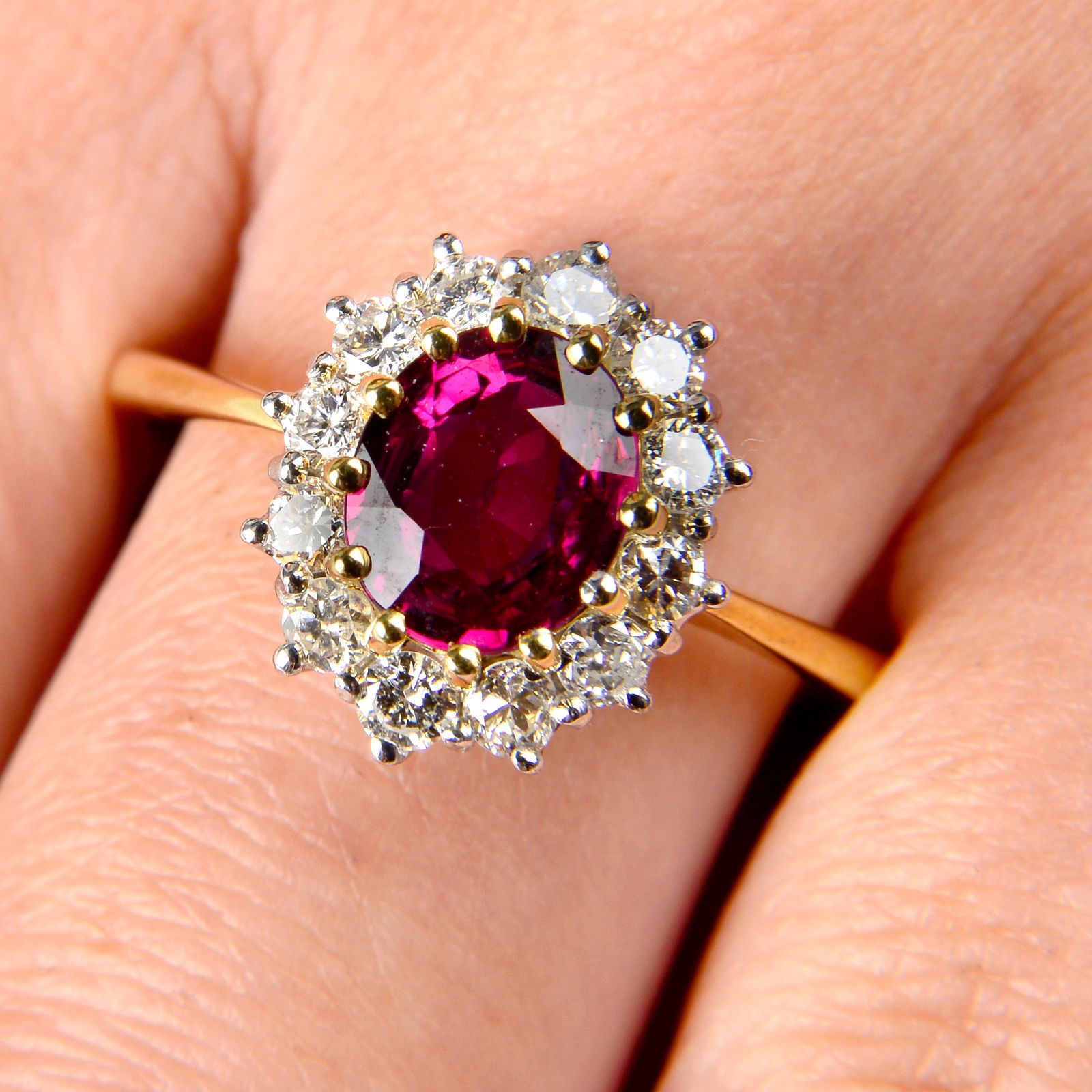 An 18ct gold ruby and diamond cluster ring.Ruby calculated weight 1.34cts, based on estimated