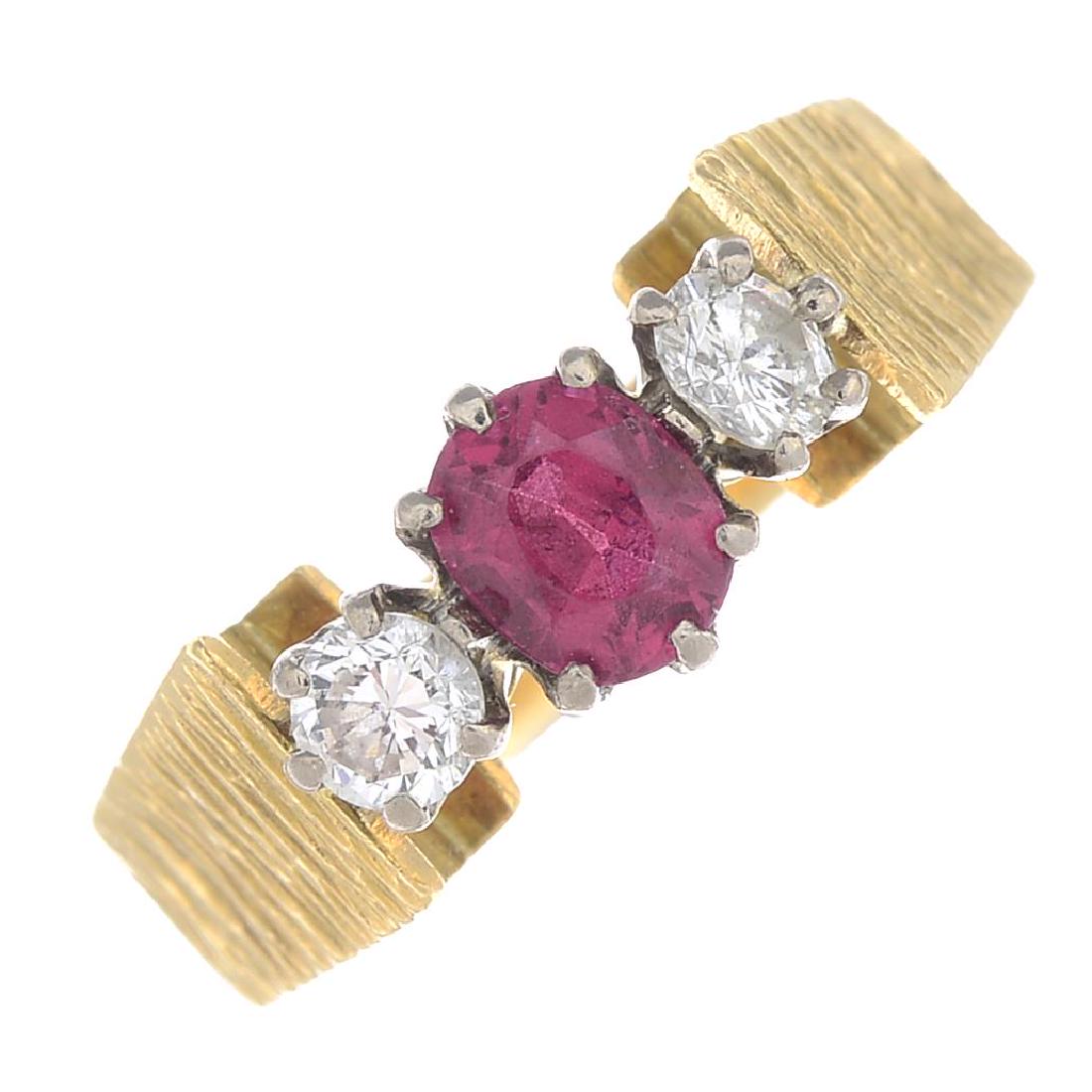 An 18ct gold ruby and diamond ring. The oval-shape