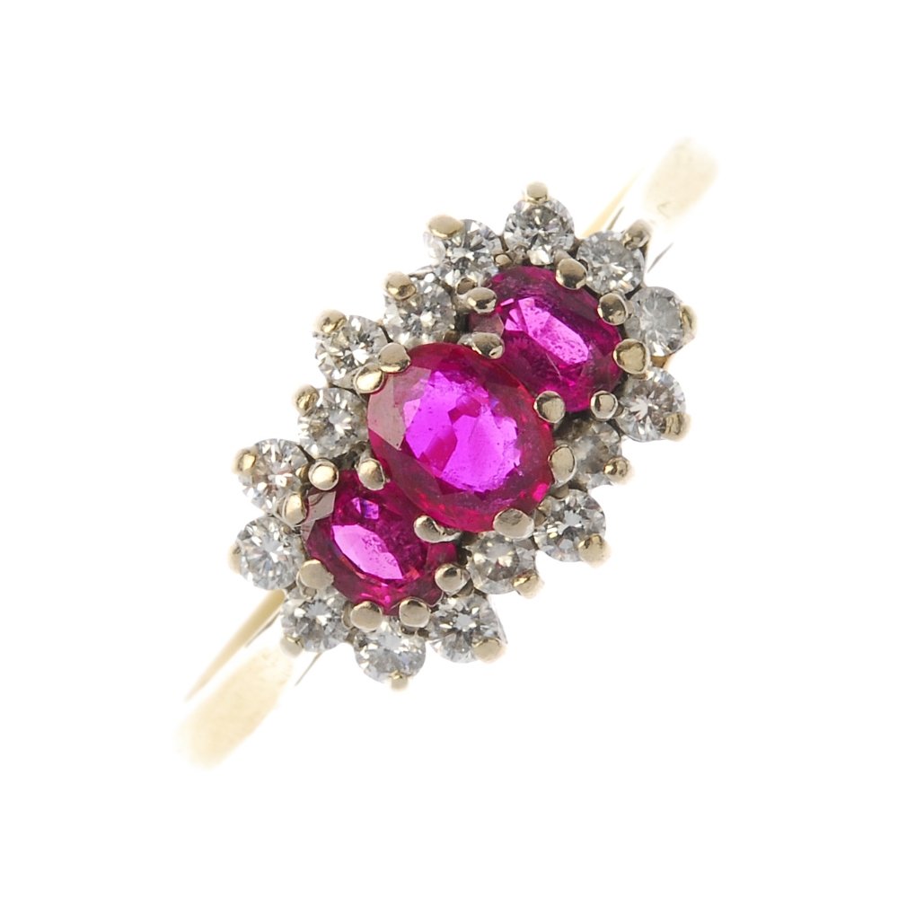 An 18ct gold ruby three-stone and diamond cluster ring.