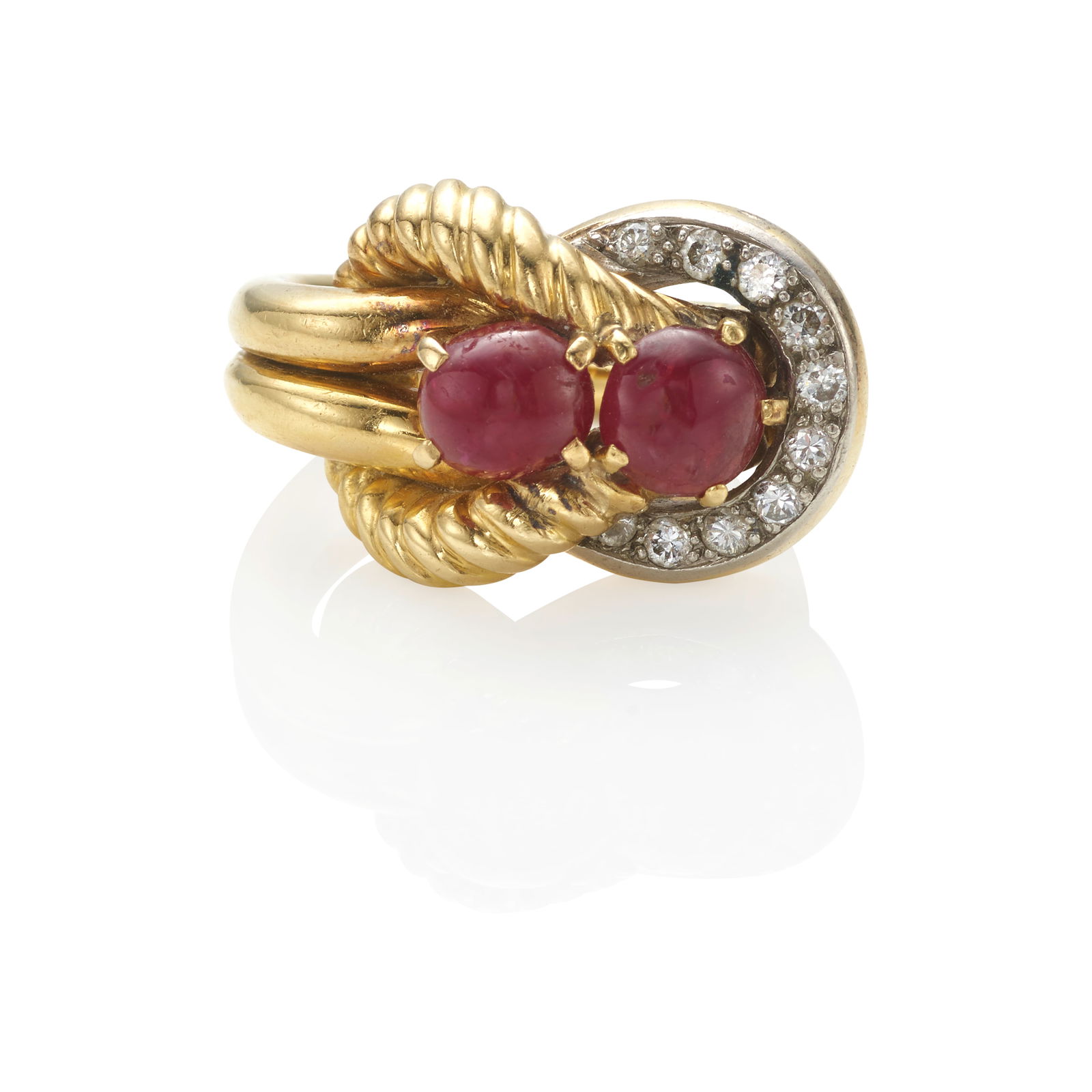 AN 18K GOLD, PLATINUM, RUBY AND DIAMOND RING, CIRCA 1940