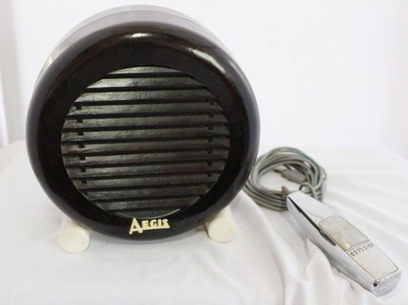 SoldPhilips Microphone, c. 1930Philips Microphone, c. 1930 Black bakelite microphone, supported by 3 coil springs in a metal frame, height 5 ¼ in. Mikrophon von Philips, um 1930 Schwarzes Bakelit-Mikrophon, mit 3 Federn in MetaSee Sold Price