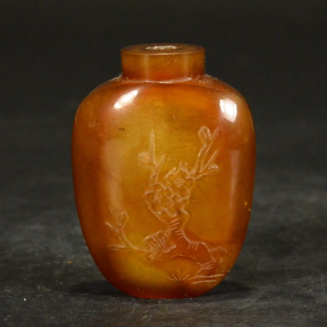 AN AGATE CARVED SNUFF BOTTLE(WITHOUT LID)