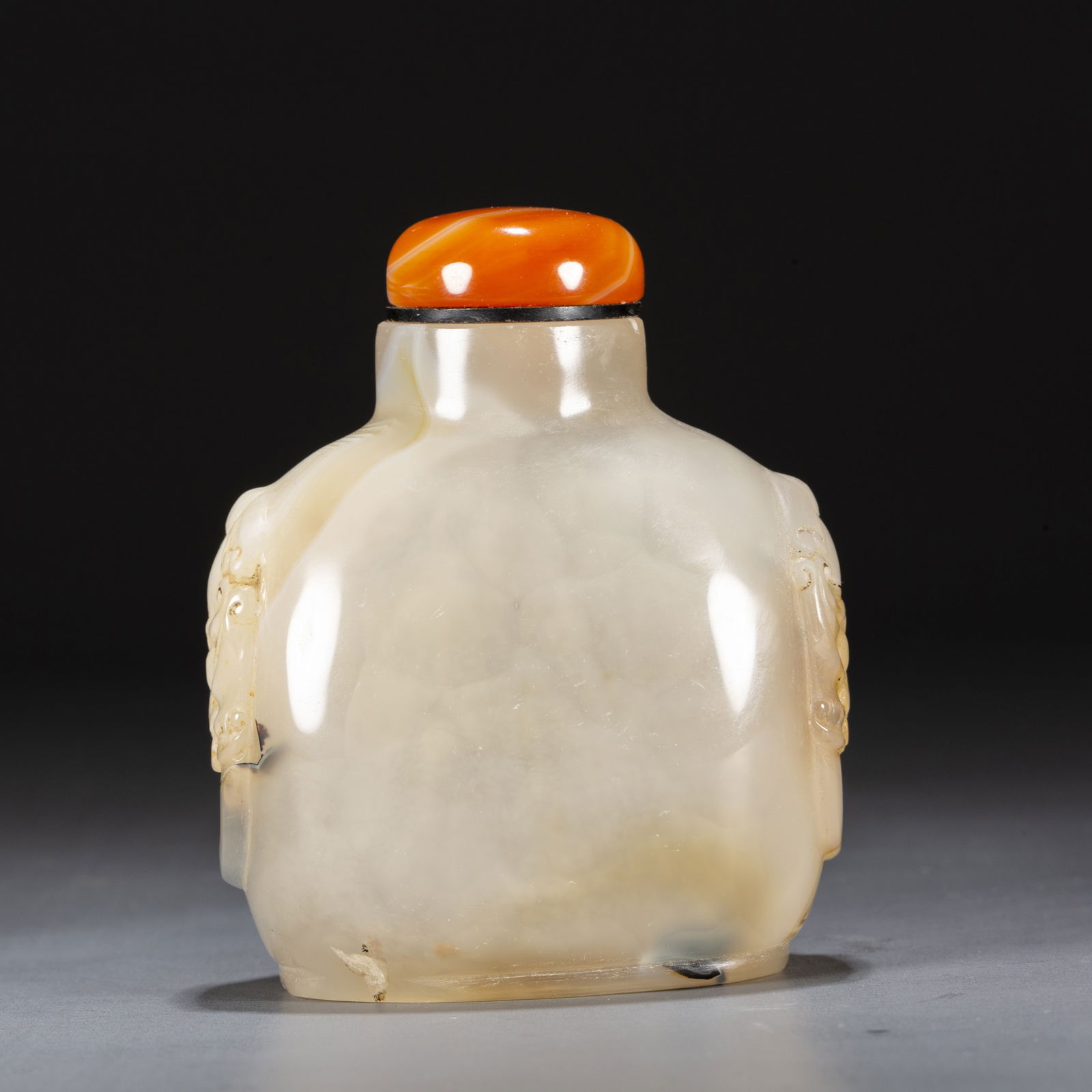 AN AGATE SNUFF BOTTLE, CARVED BEAST FACE DESIGN.
