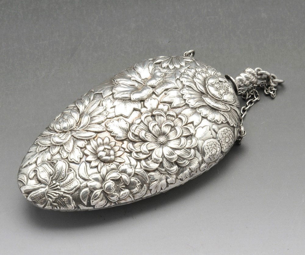 SoldThree Silver Scent Bottles and One AtomizerAmerican/British, late 19th/early 20th century, small English silver engraved case with hinged cap and glass stopper, marks for London, 2-1/4 in.; sterling repousse atomizer, mark for Gorham and RedliSee Sold Price