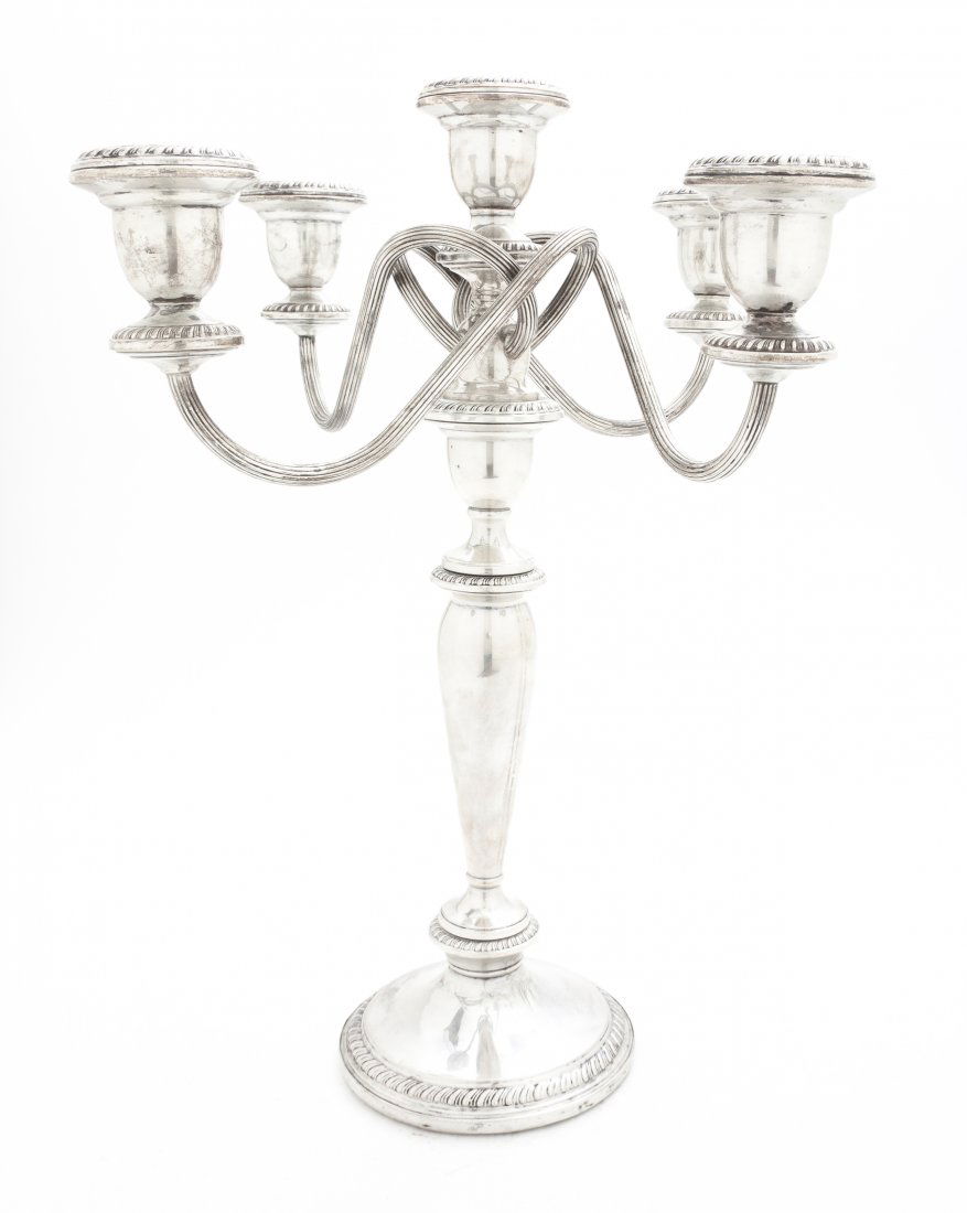 SoldPair of American Sterling Silver Five-Light CandelabraEmpire Silver Co., Brooklyn, New York, Twentieth Century. Each tapered standard above a molded circular foot, the vase-shaped nozzle supporting four S-scroll branches ending in urn-shaped nozzles centSee Sold Price
