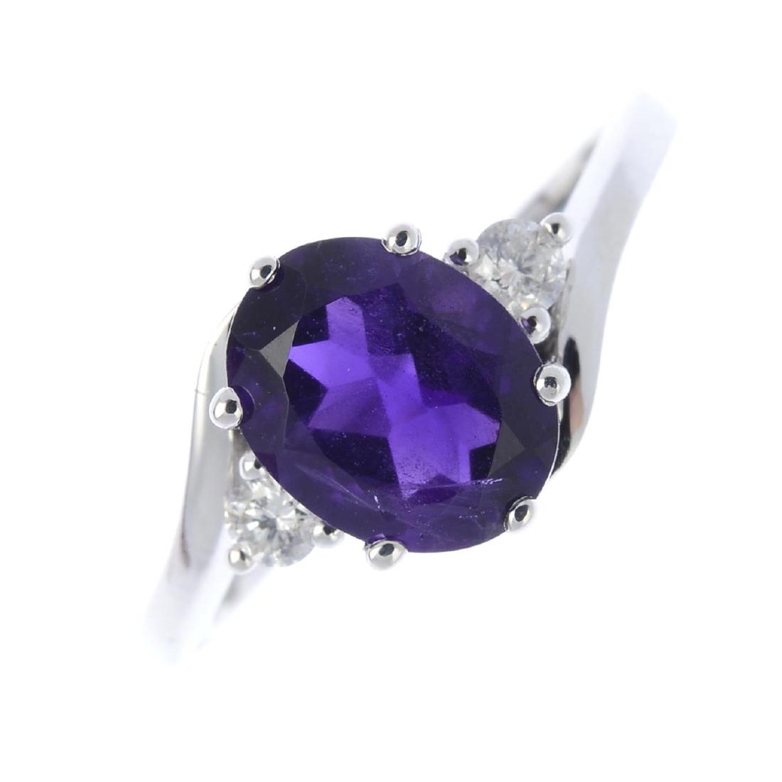 An amethyst and diamond three-stone ring. The