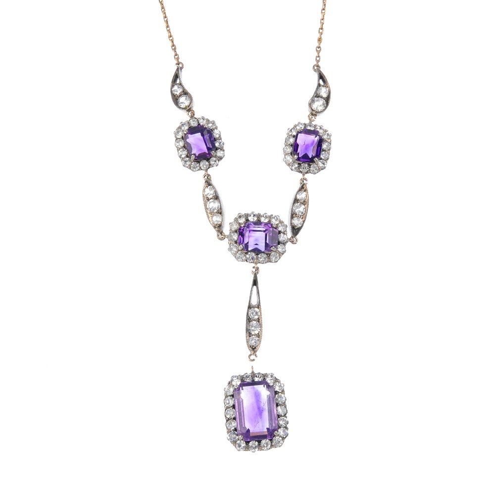 An amethyst and paste necklace. The rectangular-shape