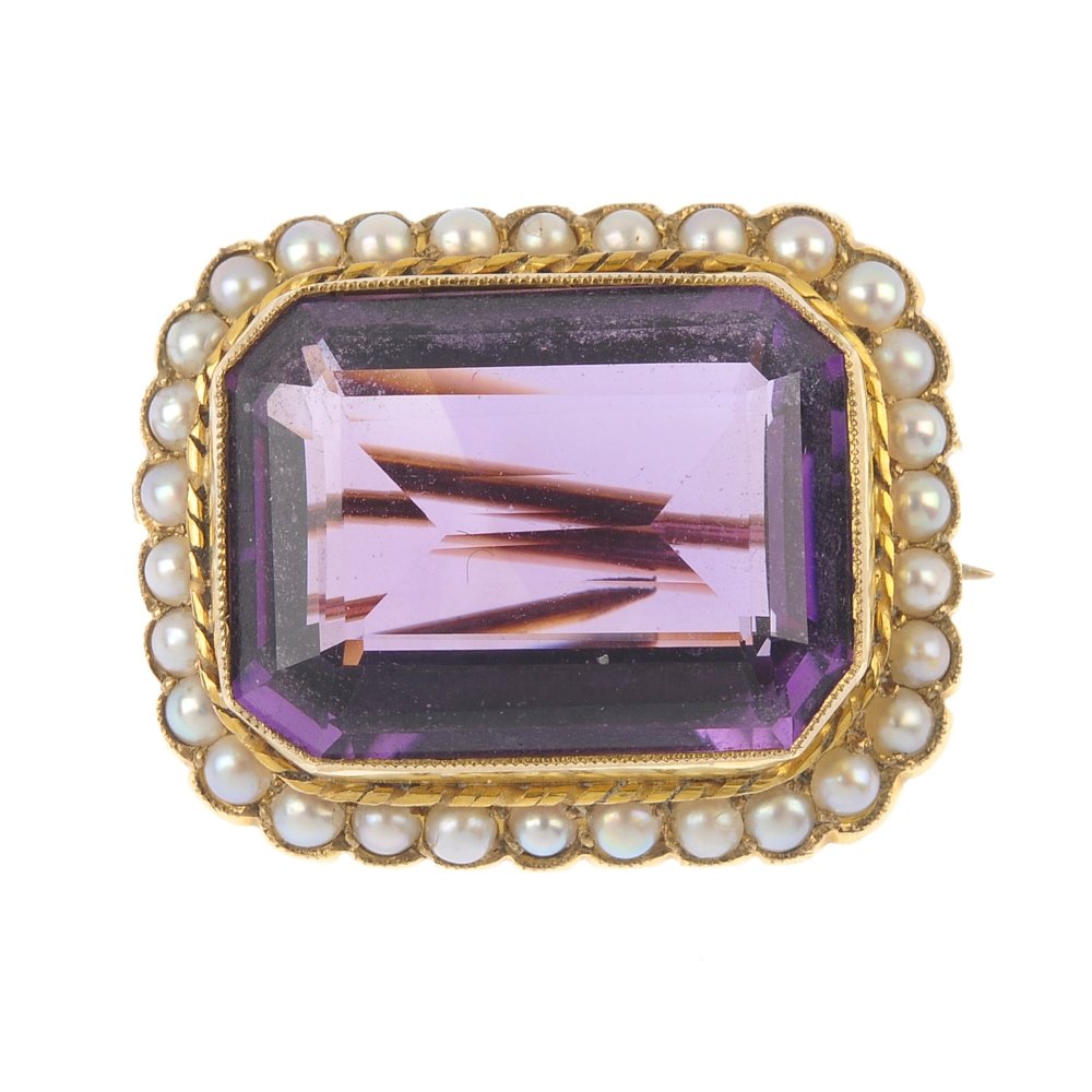 SoldAn early 20th century gold amethyst and split pearlAn early 20th century gold amethyst and split pearl cluster brooch. The rectangular-shape amethyst, within a split pearl border. Length 2cms. Weight 4.7gms.See Sold Price