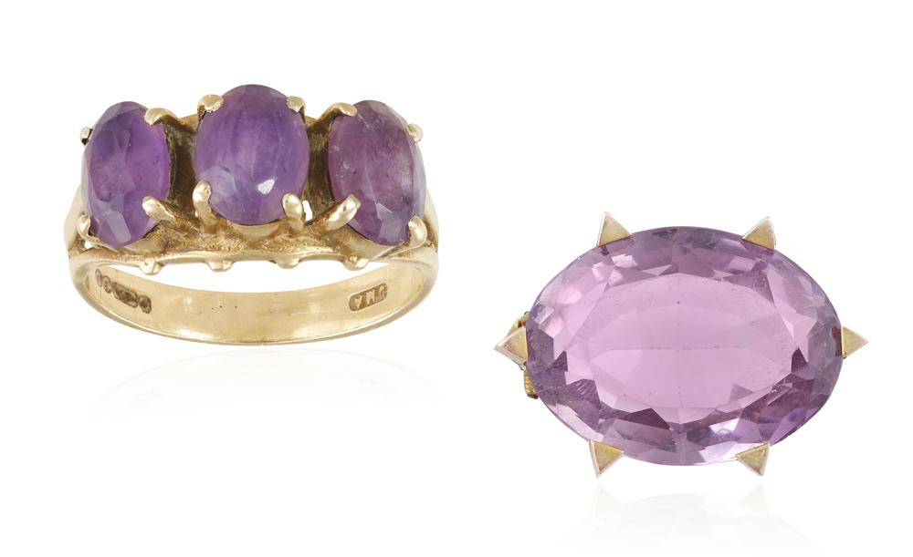 AN AMETHYST BROOCH WITH AN AMETHYST THREE-STONE RING,