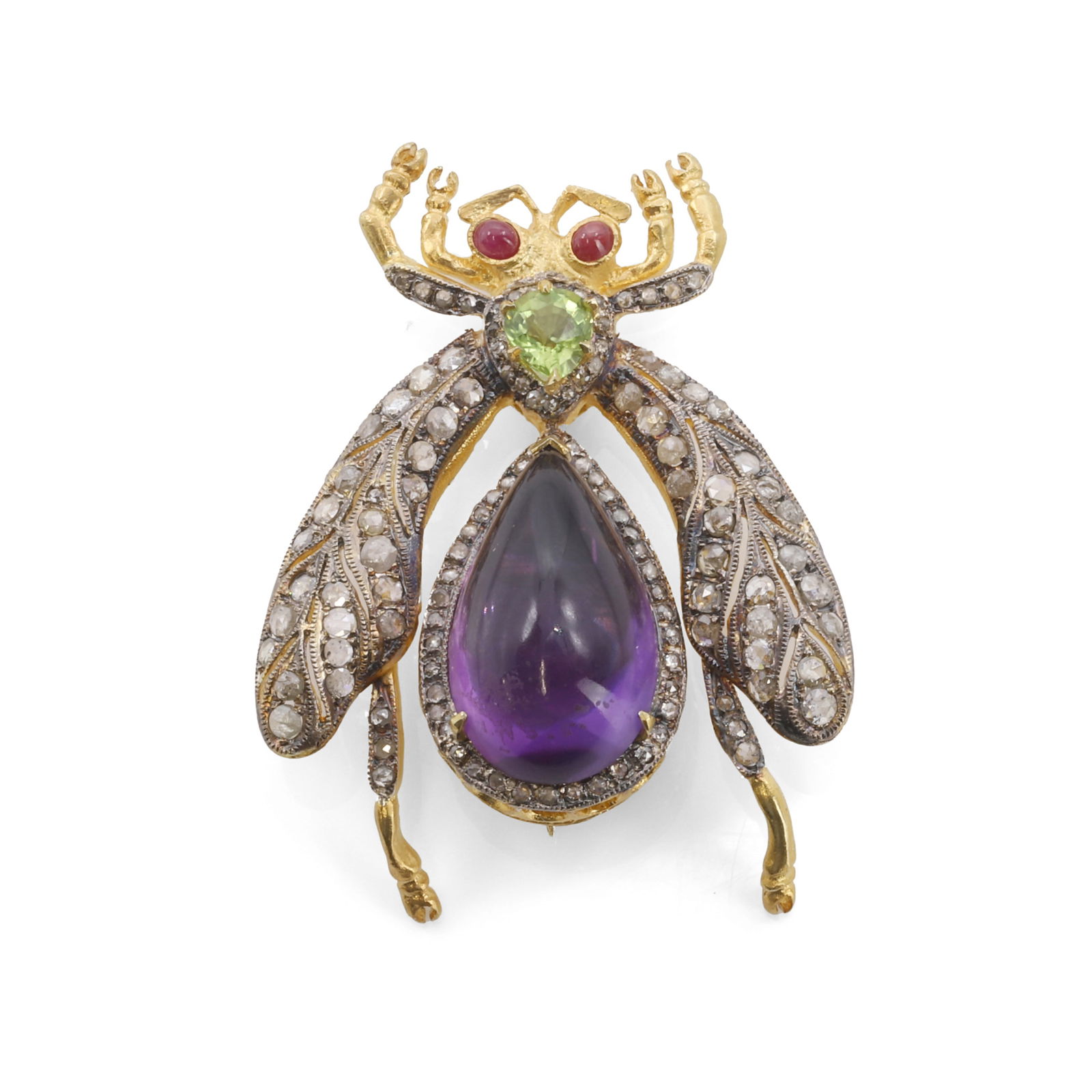 An amethyst, peridot, ruby and diamond insect brooch,