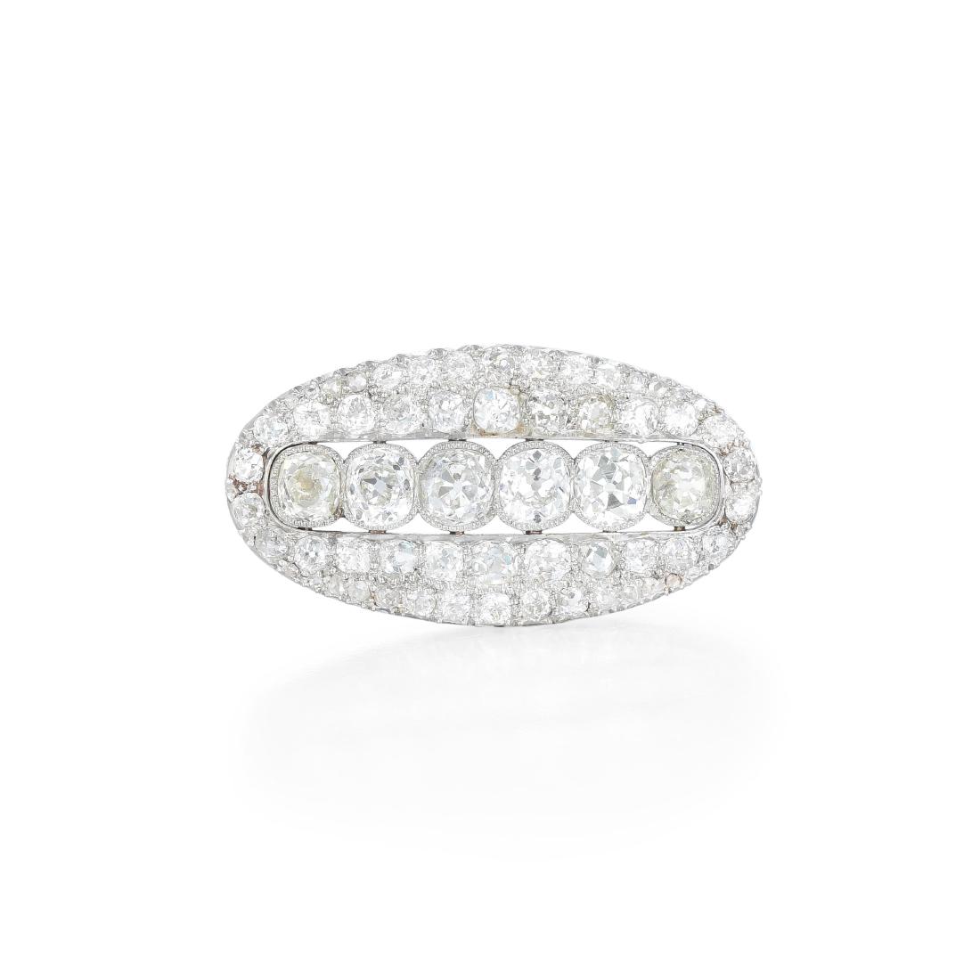 SoldAn Art Deco Diamond Oval Frame PinCrafted out of platinum with beautifully-engraved galleries, set with 24 lively old European-cut diamonds, weighing a total of approximately 3.50 carats, with E-F color and VS clarity; measures 3/4 xSee Sold Price