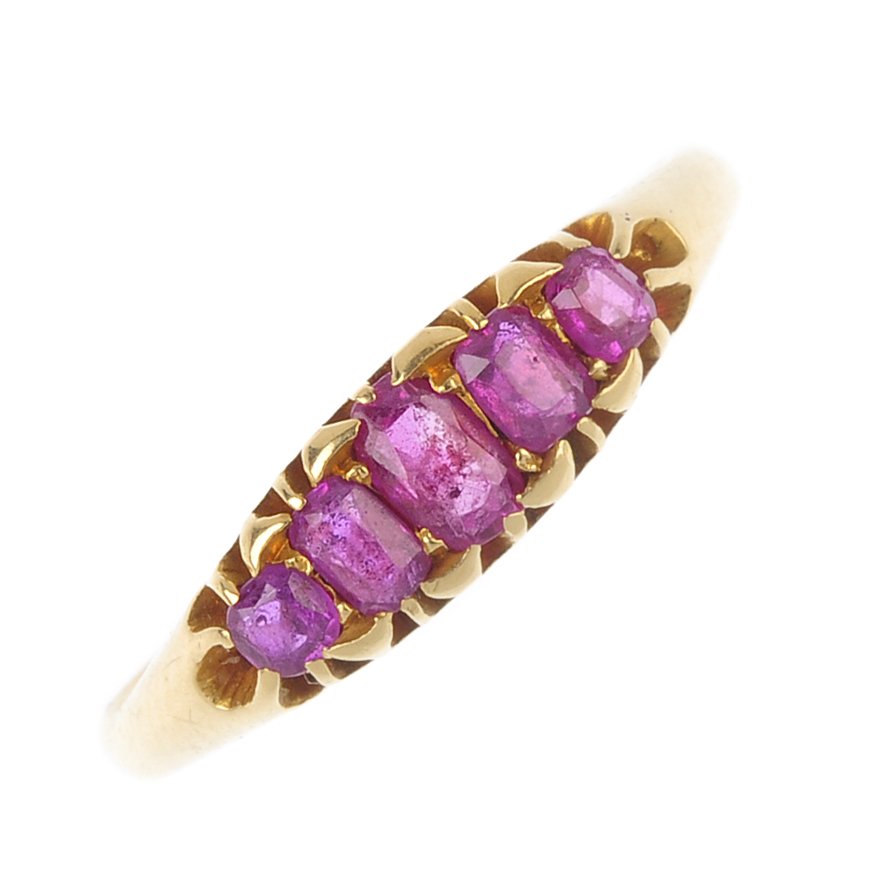 SoldA late 19th century 18ct gold ruby five-stone ring. TheA late 19th century 18ct gold ruby five-stone ring. The graduated rectangular-shape ruby line, to the grooved sides and band. Ring size Q. Weight 3.5gms. Overall condition fair to good. Some surface sSee Sold Price
