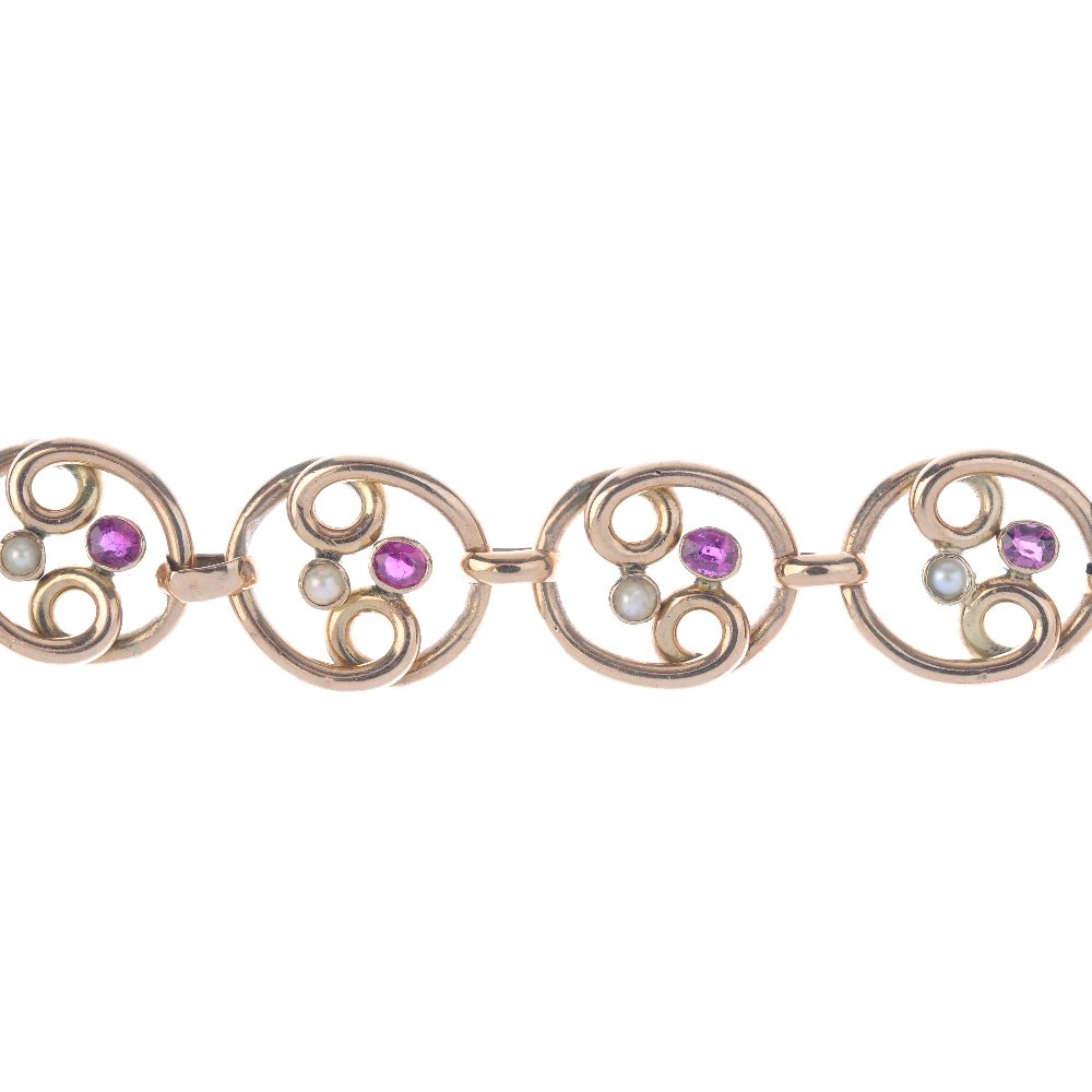 SoldAn early 20th century gold, ruby and split pearl floralAn early 20th century gold, ruby and split pearl floral necklace. The cushion-shape ruby and split pearl floral cluster and drop, to the similarly-set scrolling panel sides, with split pearl spacers aSee Sold Price